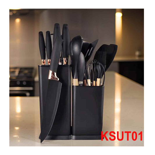 KSUT01-19-tlg Messerset & Küchenhelfer Kochbesteck Set Silikon Holzgriff Schneidebrett