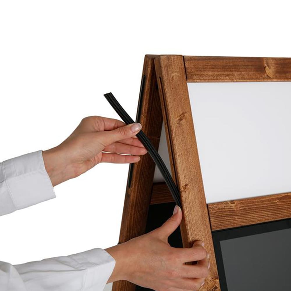 Zwei Antireflex-UV-Schutzfolien mit Magnetband sind bereits im Lieferumfang enthalten. Damit lassen sich DIN A1 Poster oder Plakate sicher und wettergeschützt anbringen. Ohne Folie kannst du die Tafel ganz einfach mit Kreide oder Kreidemarkern beschriften.