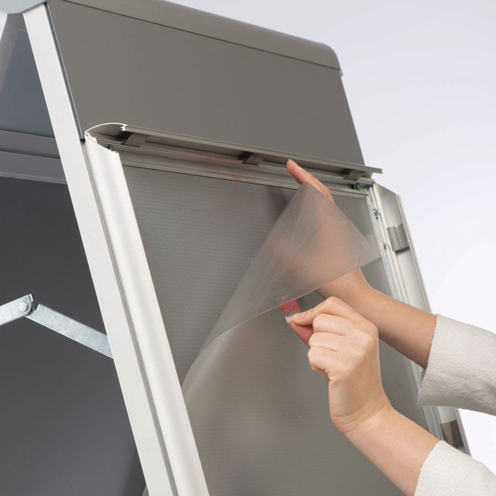 Die transparente Schutzfolie des Klapprahmens schützt deine Plakate zuverlässig vor Schmutz und Feuchtigkeit.