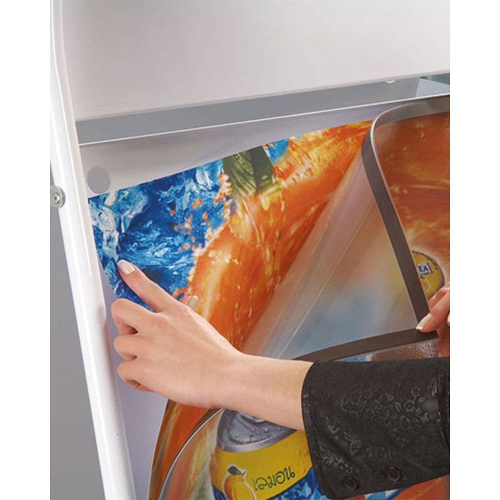 Die mitgelieferten magnetischen Antireflex-UV-Schutzfolien schützen deine Plakate vor Feuchtigkeit und Licht, während das runde Topschild ideal für eine individuelle Folienbeschriftung oder einen Aufkleber genutzt werden kann. So trennst du dein Logo elegant von deiner Werbebotschaft – für maximale Wirkung direkt am Point of Sale.