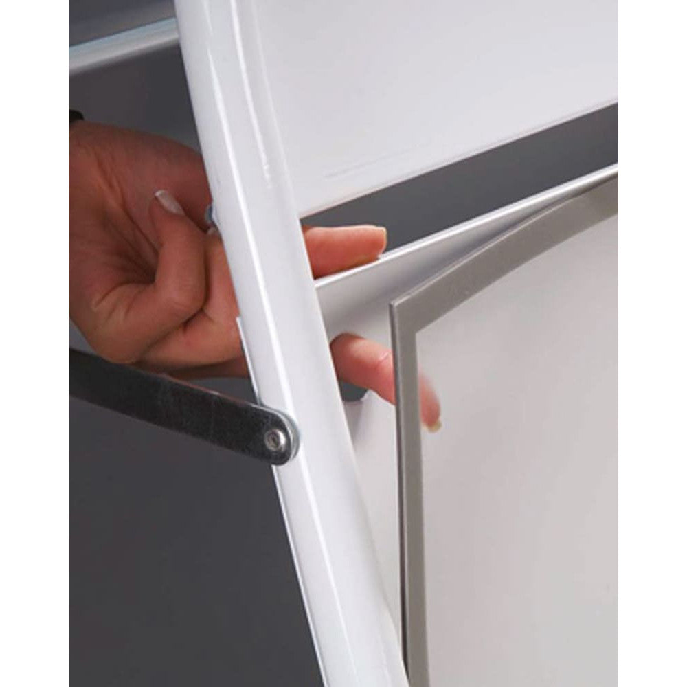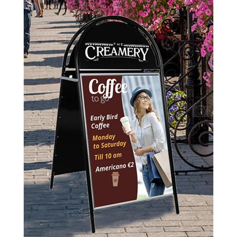 Erhältlich in Weiss, Schwarz, Rot oder Silber, passt sich dieser Gehwegaufsteller jedem Umfeld harmonisch an – ob vor Restaurants, Cafés, Boutiquen, Bars, Tankstellen oder an Messen und Veranstaltungen.