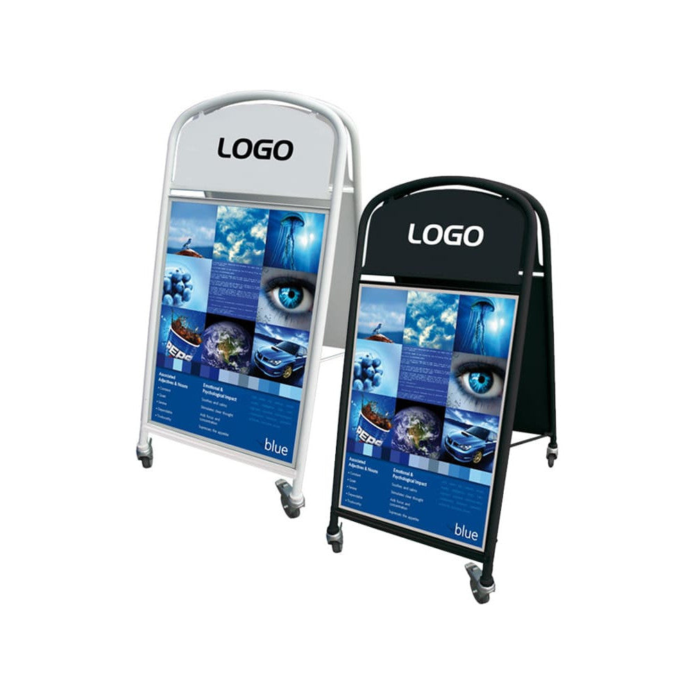 Schwerer Kundenstopper aus Stahl mit Logoschild Ellipse - Rollbarer DIN A1 Plakatständer in Weiss & Schwarz