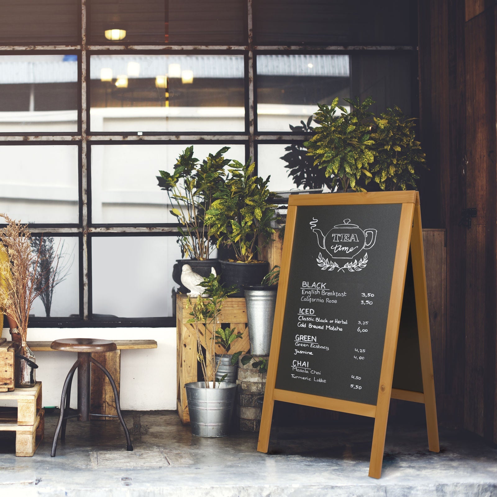 Mit einer Schreibfläche von 58 x 88 cm, einem stabilen hellbraunen Holzrahmen und beidseitig nutzbaren Tafeln ist der Kundenstopper besonders vielseitig. Er wird vor allem in der Gastronomie eingesetzt – von Restaurants und Bars bis hin zu Cafés oder Bäckereien – eignet sich aber ebenso gut für den Einzelhandel. Dank der wetterfesten Verarbeitung kannst du ihn sowohl im Innen- als auch im Aussenbereich einsetzen.