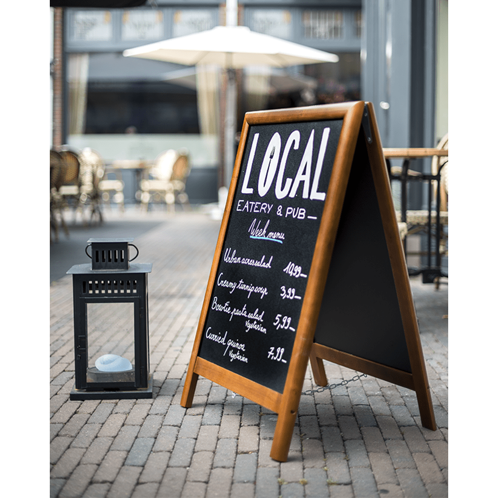 Ob im Innen- oder Aussenbereich – dieser dunkelbraune Deluxe Holz Kundenstopper setzt deine Angebote stilvoll in Szene und zieht garantiert die Aufmerksamkeit deiner Gäste und Kunden auf sich.