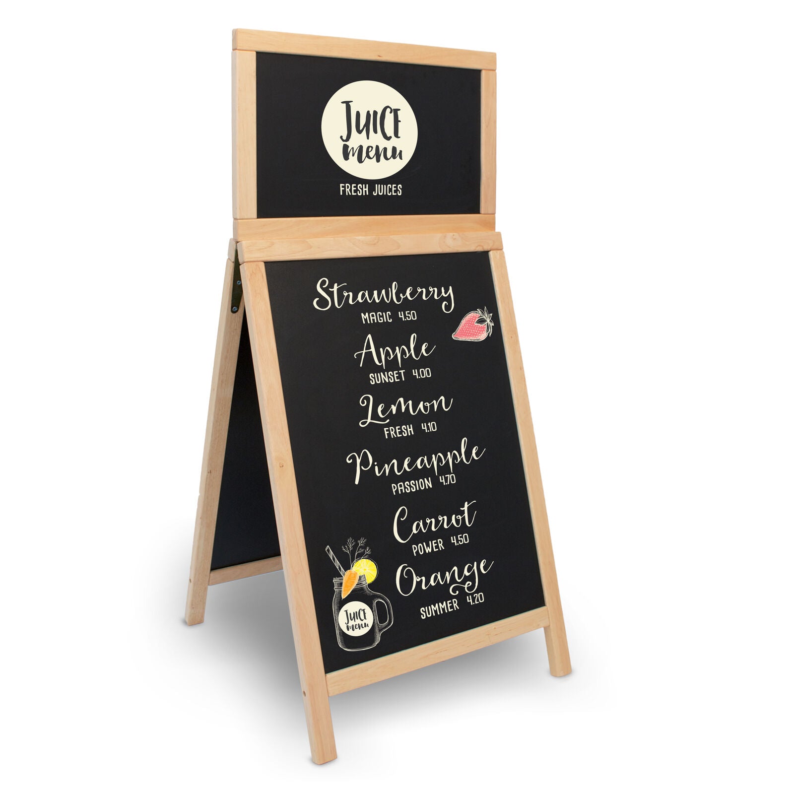 Ein besonderes Detail ist das praktische Topschild, das du oben einfach einsetzen kannst. Viele Gastronomen nutzen diese Zusatzfläche, um ihr Logo, den Schriftzug „Menü“ oder „Angebot“ hervorzuheben. So hebst du deine Werbung noch stärker hervor und gibst deinem Aufsteller eine individuelle Note.