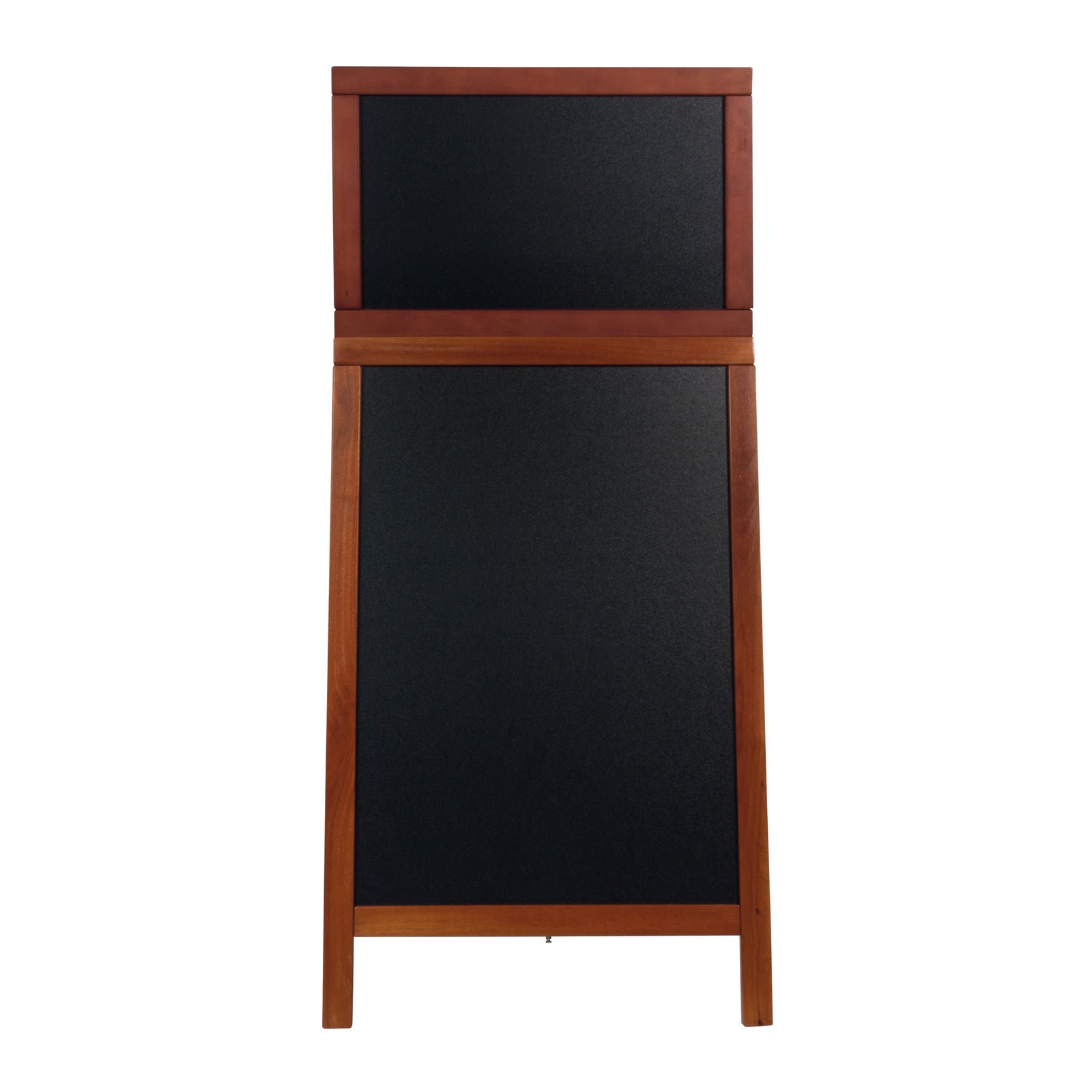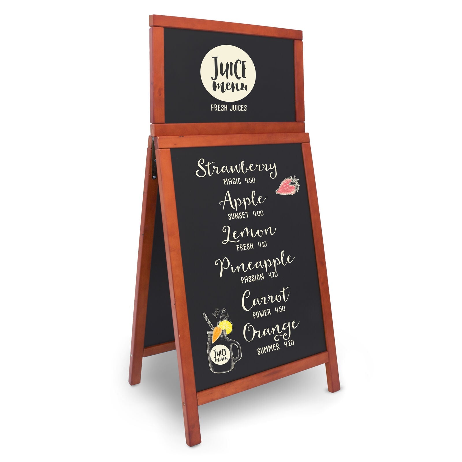 Mit seinen kompakten Massen, zwei beidseitig beschriftbaren Tafeln und einem zusätzlichen Logoschild mit 27,5 cm Höhe ist dieser Kundenstopper ein vielseitiger Allrounder für Innen- und Aussenbereiche. Dank der hochwertigen Verarbeitung in Mahagoni wirkt er nicht nur professionell, sondern auch besonders einladend.