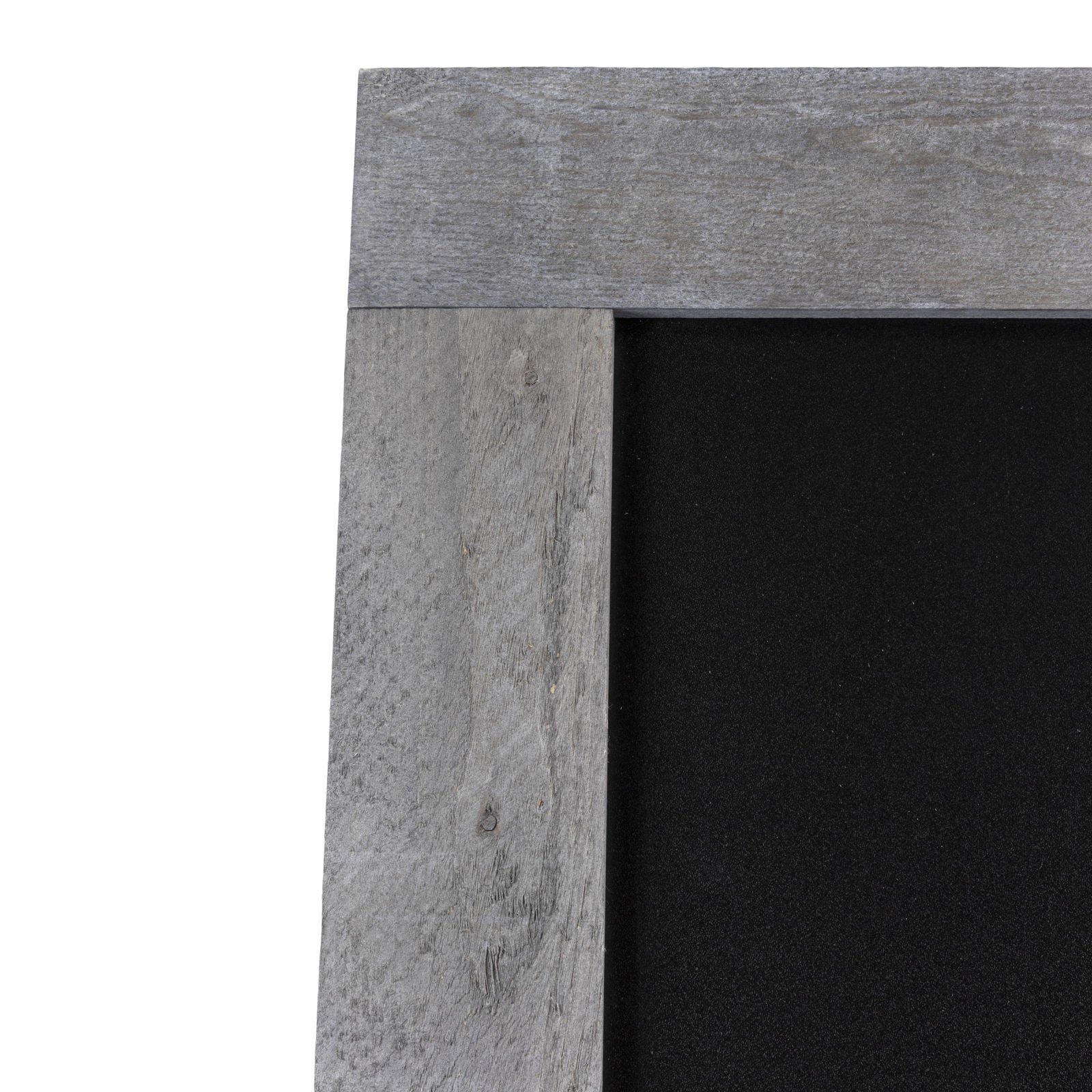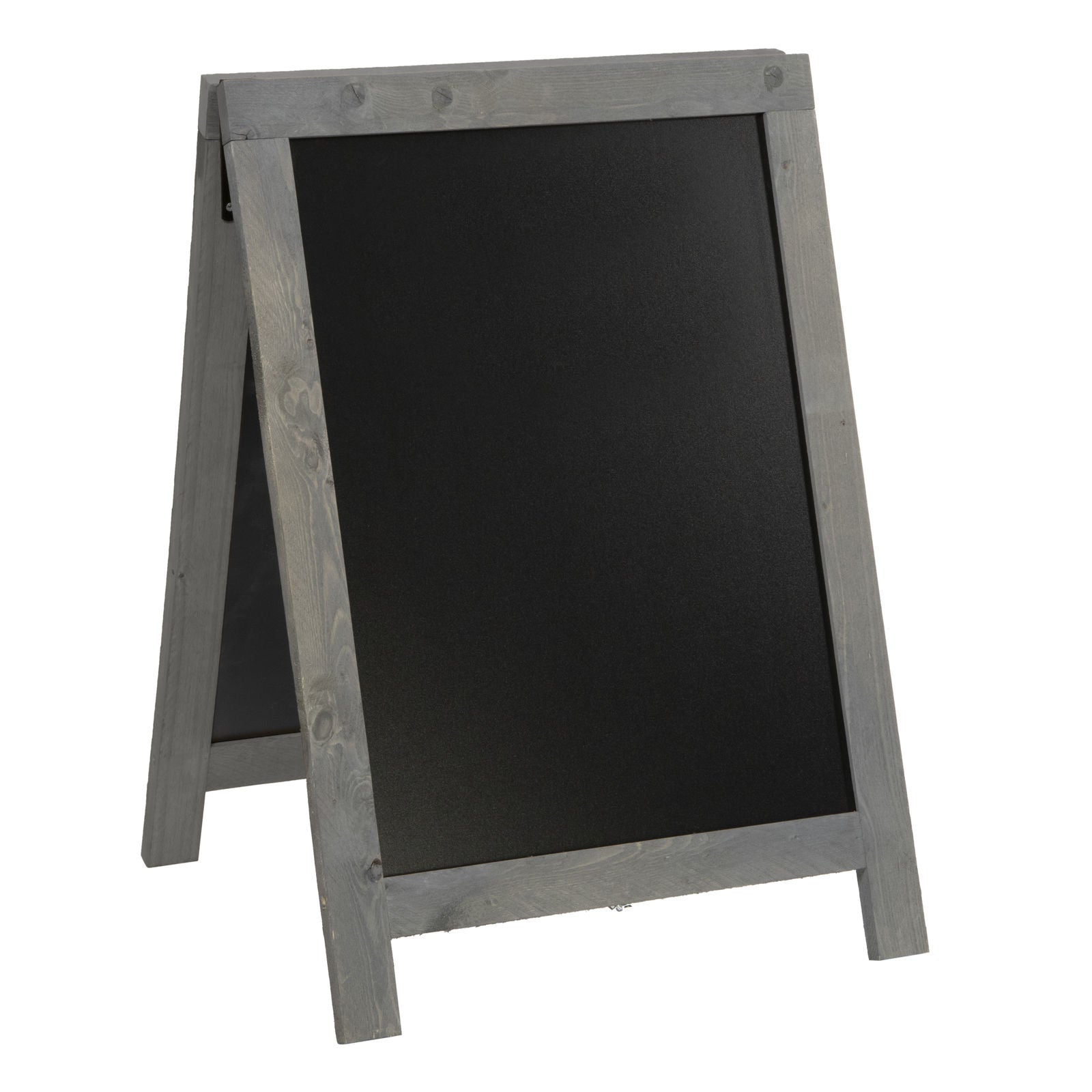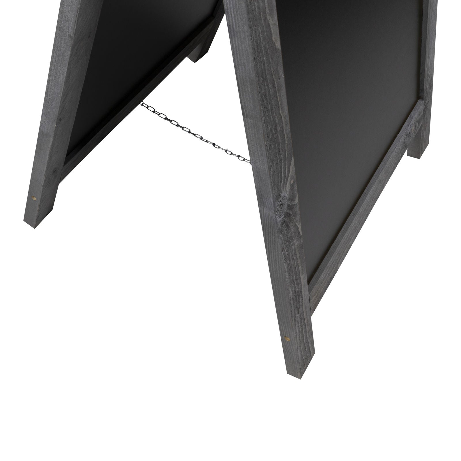 Der robuste Holzrahmen in rustikalem Grau ist für den Innen- und Aussenbereich geeignet. Zwei Scharniere am oberen Ende verbinden die beschriftbaren Tafeln sicher und ermöglichen ein einfaches Auf- und Zuklappen. Eine rostfreie Abstandskette sorgt für optimale Aufstelltiefe und sicheren Halt. Die schwarze Kreidetafel mit einer Fläche von 67 x 47 cm bietet dir ausreichend Platz, um deine Botschaften kreativ und sichtbar zu gestalten.